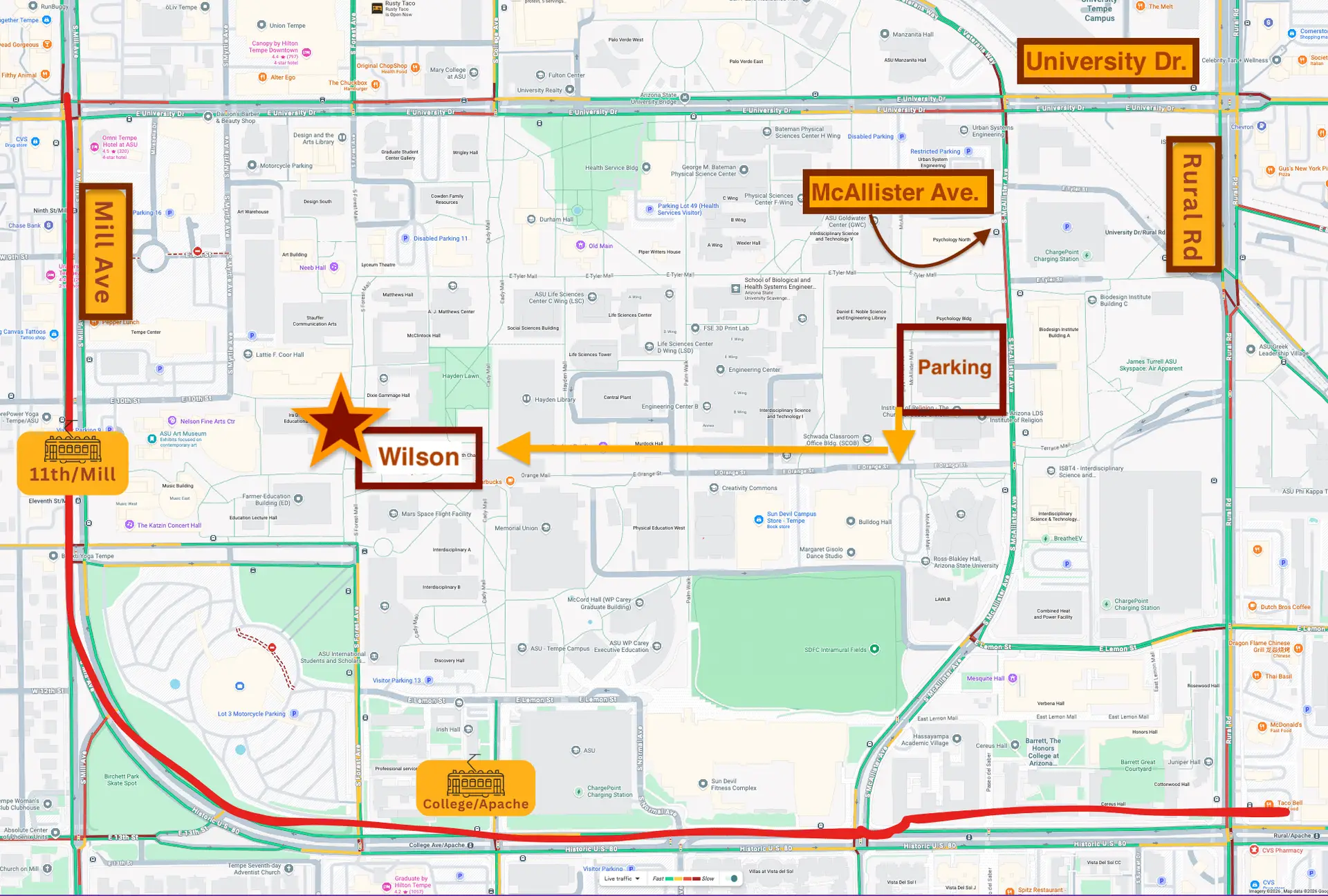 Registration and check-in starts at 5:30pm at Wilson Hall on the Tempe Campus. Wilson Hall is northeast of the Gammage Auditorium near the intersection of Gammage Parkway and Forest Ave.